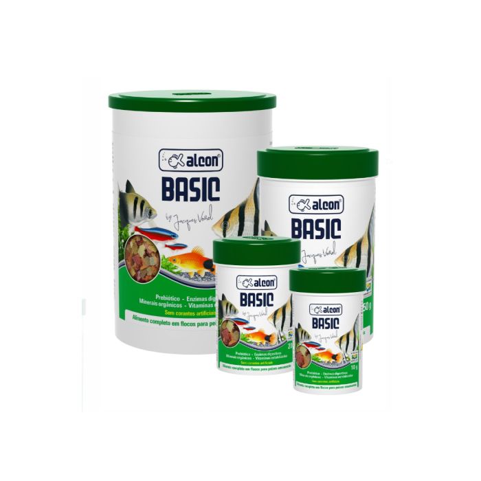 Alcon Basic é um alimento completo em flocos desenvolvido para peixes ornamentais. Sua fórmula usa ingredientes naturais selecionados, com minerais orgânicos quelatados, enzimas digestivas e prebiótico, promovendo melhor digestão e aproveitamento nutricional.