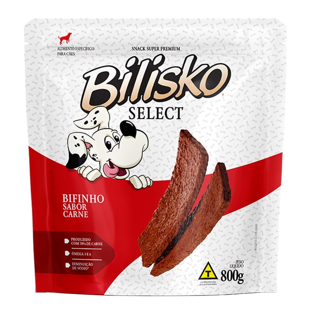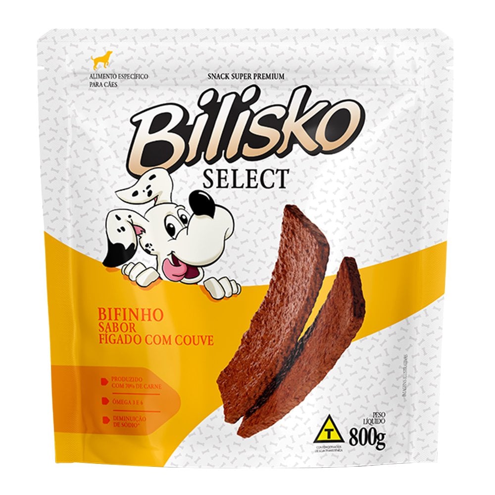 Bifinho Bilisko 800 g — petisco saboroso e nutritivo para cães, disponível em vários sabores (Carne, Frango, Fígado, Maçã & Cenoura). Ideal como recompensa no adestramento, petisco de convivência ou mimo diário, para cães de todas as idades e portes.