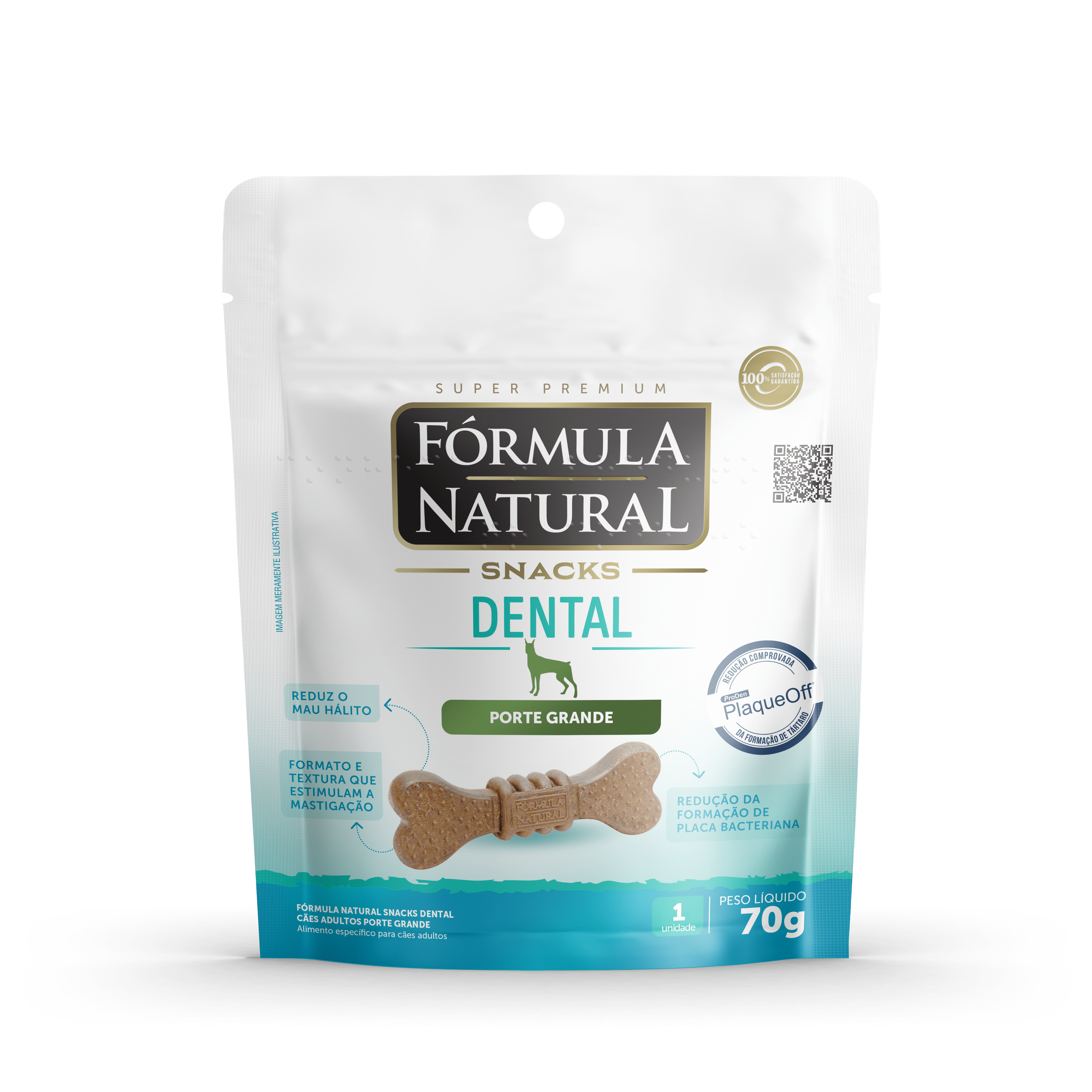 O Snack Fórmula Natural Dental é ideal para cães adultos de grande porte, oferecendo ação funcional que auxilia na redução da placa bacteriana e do tártaro.