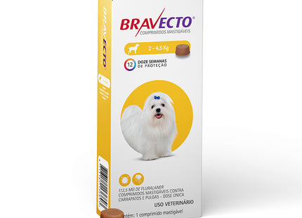 Bravecto 112,5 mg é um comprimido mastigável antiparasitário indicado para cães de pequeno porte, pesando entre 2 e 4,5 kg.