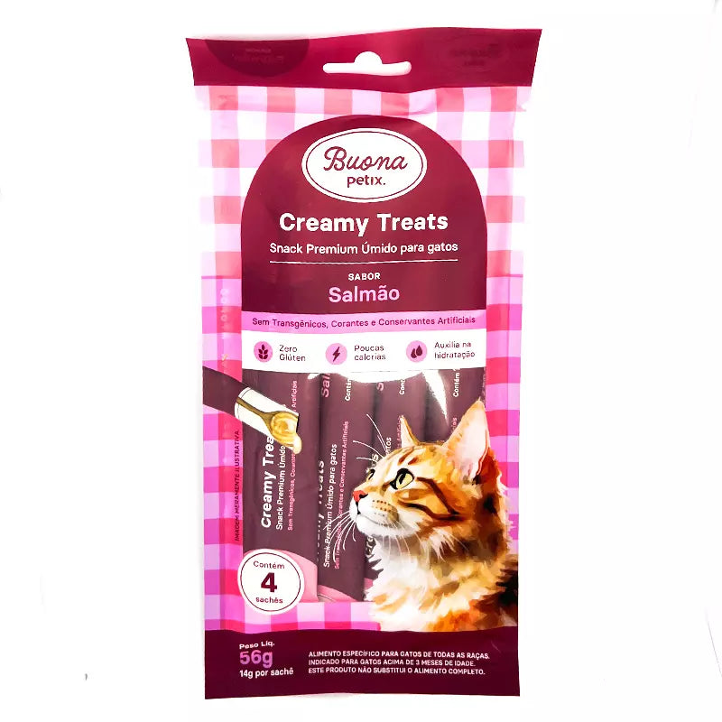 Buona Petix Creamy é um petisco cremoso especialmente desenvolvido para gatos adultos de todas as raças, ideal para momentos de carinho, agrado ou como complemento da alimentação diária.