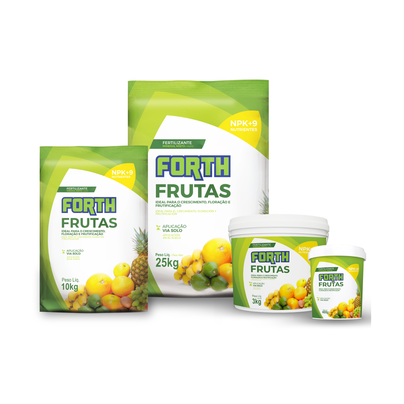 Forth Frutas é um fertilizante especialmente formulado para plantas frutíferas, disponível nos formatos sólido (10 kg, 25 kg, 3 kg, 400 g) e líquido concentrado (60 mL). Ele fornece macro e micronutrientes essenciais para estimular floração, pegamento de frutos e produtividade.