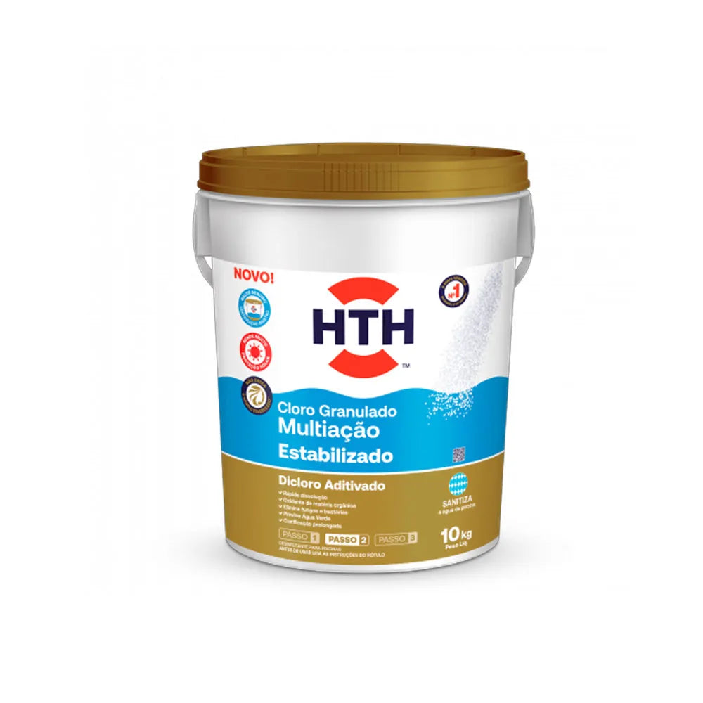 O Cloro HTH Dicloro Multi 10 Kg é um produto químico estabilizado em granulado com ação 3‑em‑1 para piscinas: desinfeta, combate algas e clarifica a água. Ideal para quem busca eficiência, praticidade e custo‑benefício no tratamento da água.