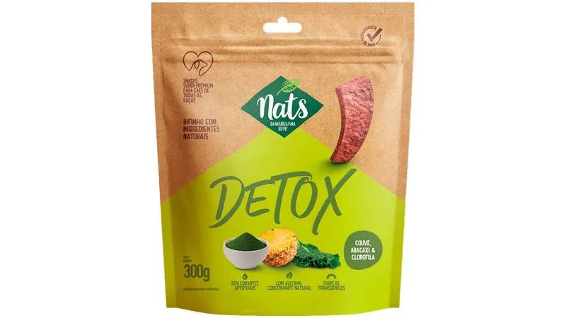 Bifinho Natural Nats NatDetox é um petisco funcional formulado para auxiliar o organismo do seu cão no processo de detoxificação. Ideal para quem busca um agrado saudável e com função nutricional, é feito com ingredientes naturais como couve, abacaxi e clorofila, que ajudam a regular o intestino e promover saciedade.