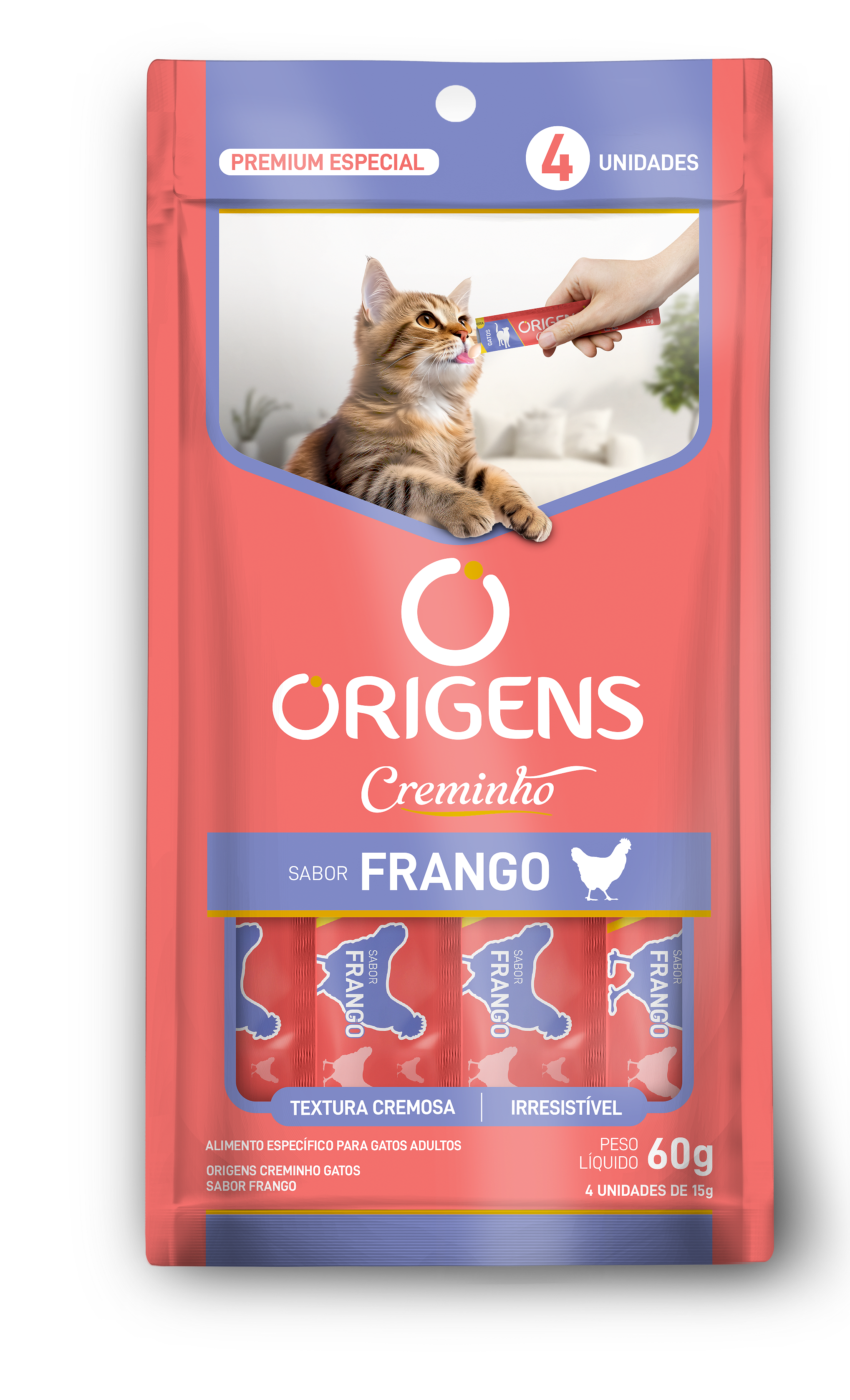 Origens Creminho Gatos é um petisco cremoso especialmente desenvolvido para encantar seu gato com textura suave e sabor apetitoso.