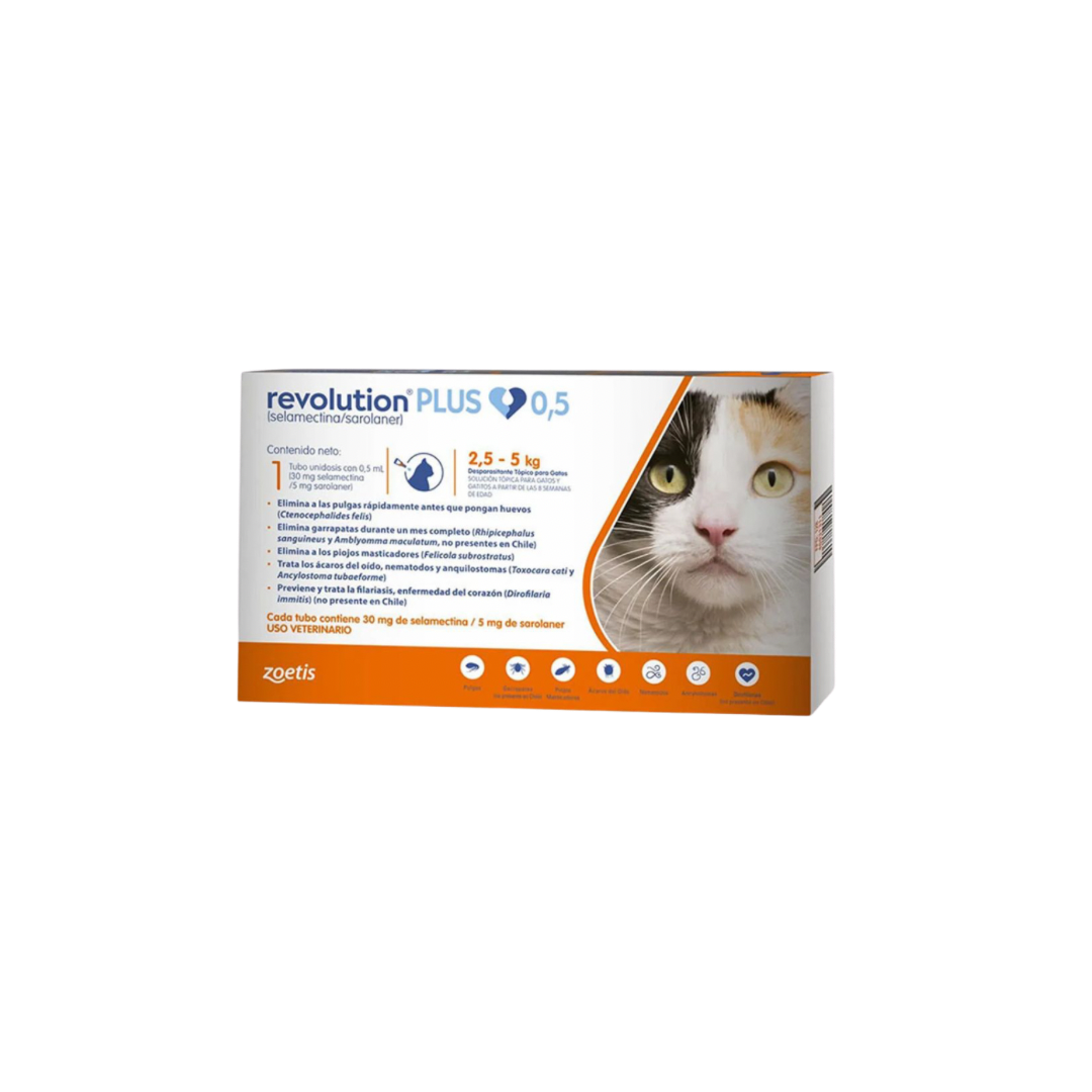 Revolution Plus Gato 0,5 mL (2,6‑5 kg) é uma solução tópica de amplo espectro, desenvolvida para gatos com peso entre aproximadamente 2,6 kg e 5 kg, a partir de 8 semanas de idade, que protege contra múltiplos parasitas internos e externos.