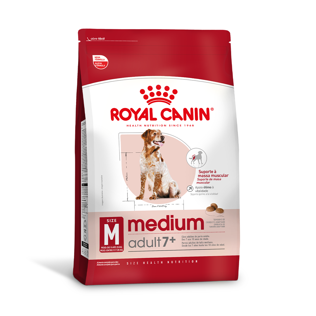 Royal Canin Medium Adult 7+ é um alimento seco completo e equilibrado, desenvolvido especialmente para cães adultos de porte médio (aproximadamente 11 a 25 kg) a partir de 7 anos de idade.