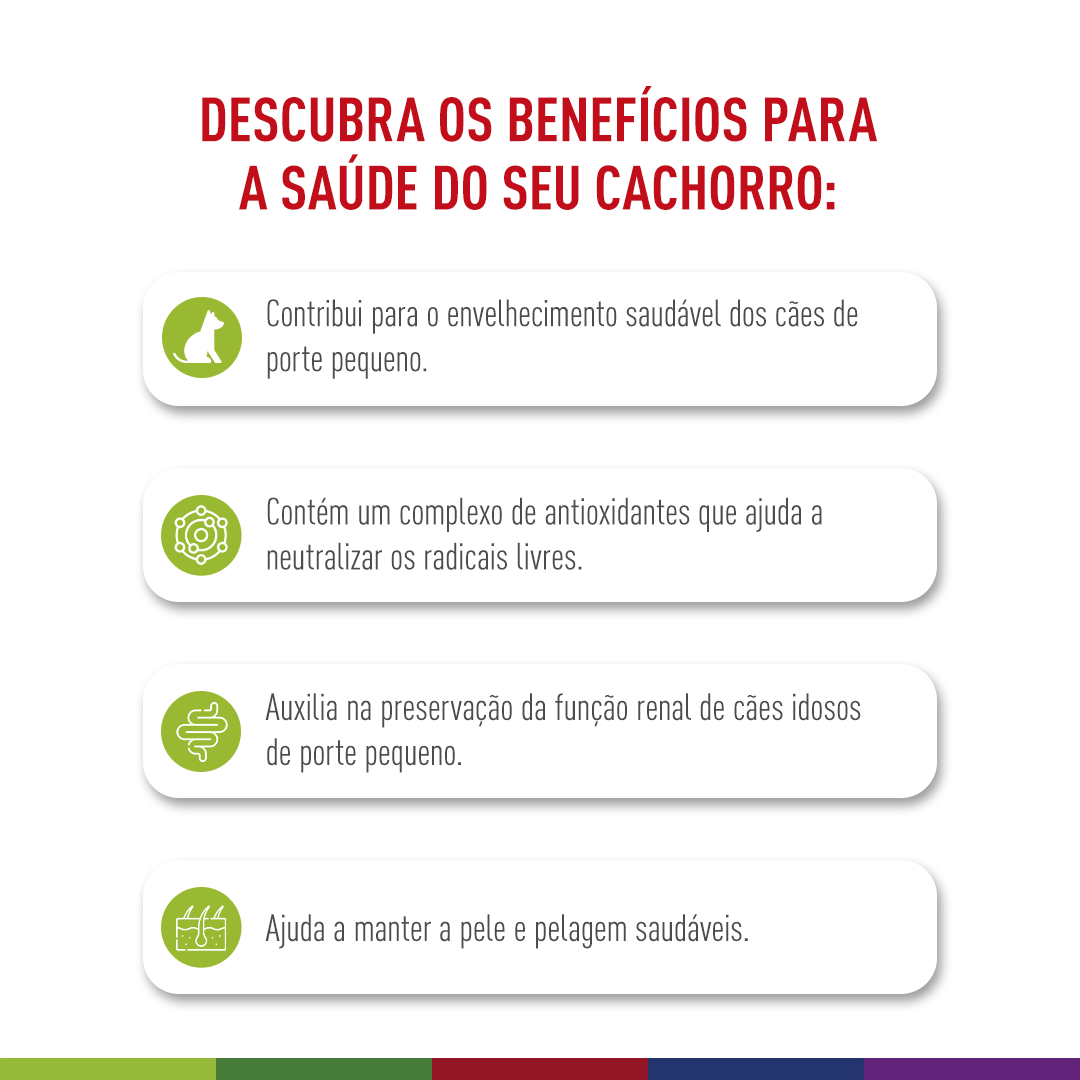 - Envelhecimento saudável: Fórmula com complexo exclusivo de antioxidantes para ajudar a neutralizar os radicais livres em cães miniatura idosos.