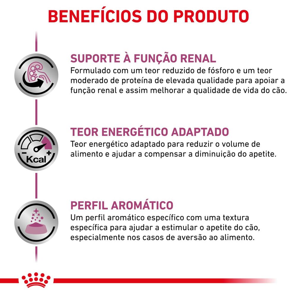 Royal Canin Veterinary Diet Renal Wet Canine 410 g é um alimento coadjuvante úmido indicado para cães adultos com insuficiência renal crônica ou lesão renal aguda.