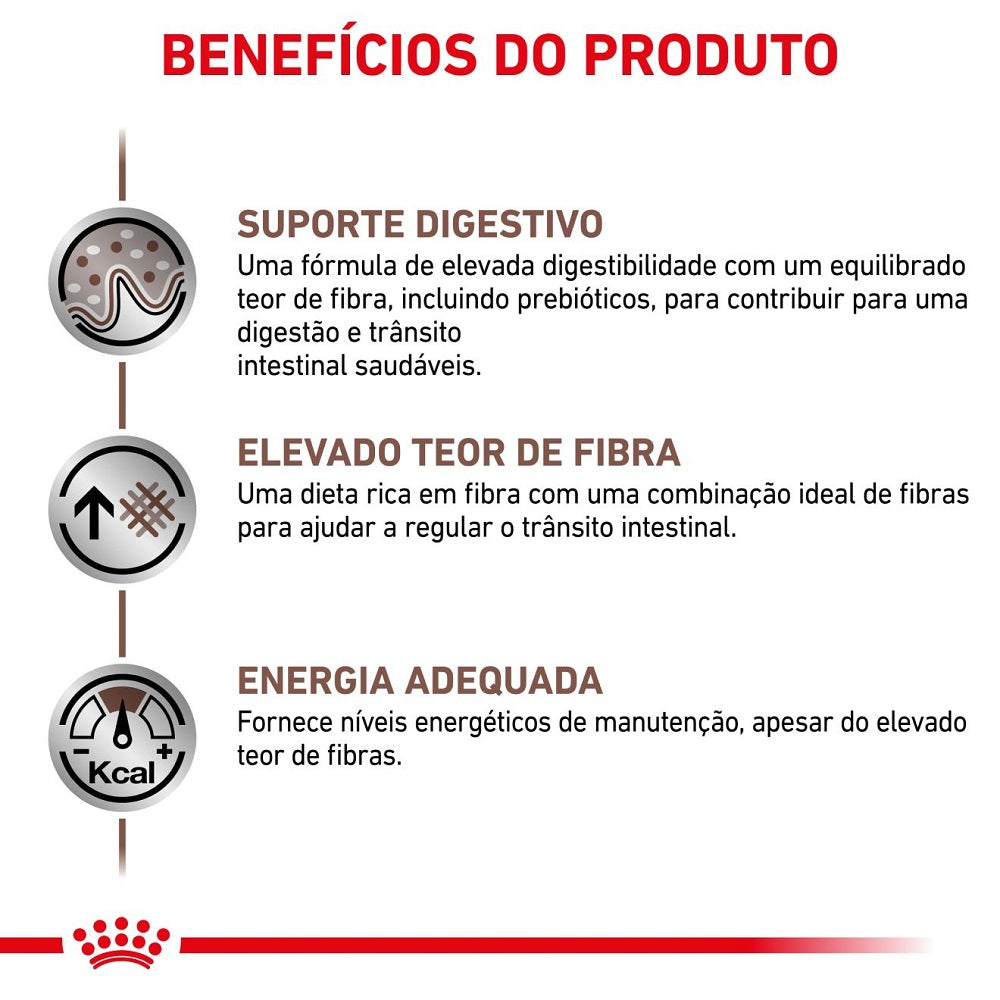 A ração Royal Canin Veterinary Diet Gastrointestinal High Fibre Canine é um alimento completo e balanceado, formulado especialmente para cães adultos com sensibilidades gastrointestinais ou distúrbios de trânsito intestinal, exigindo alimentação terapêutica com alto teor de fibras.