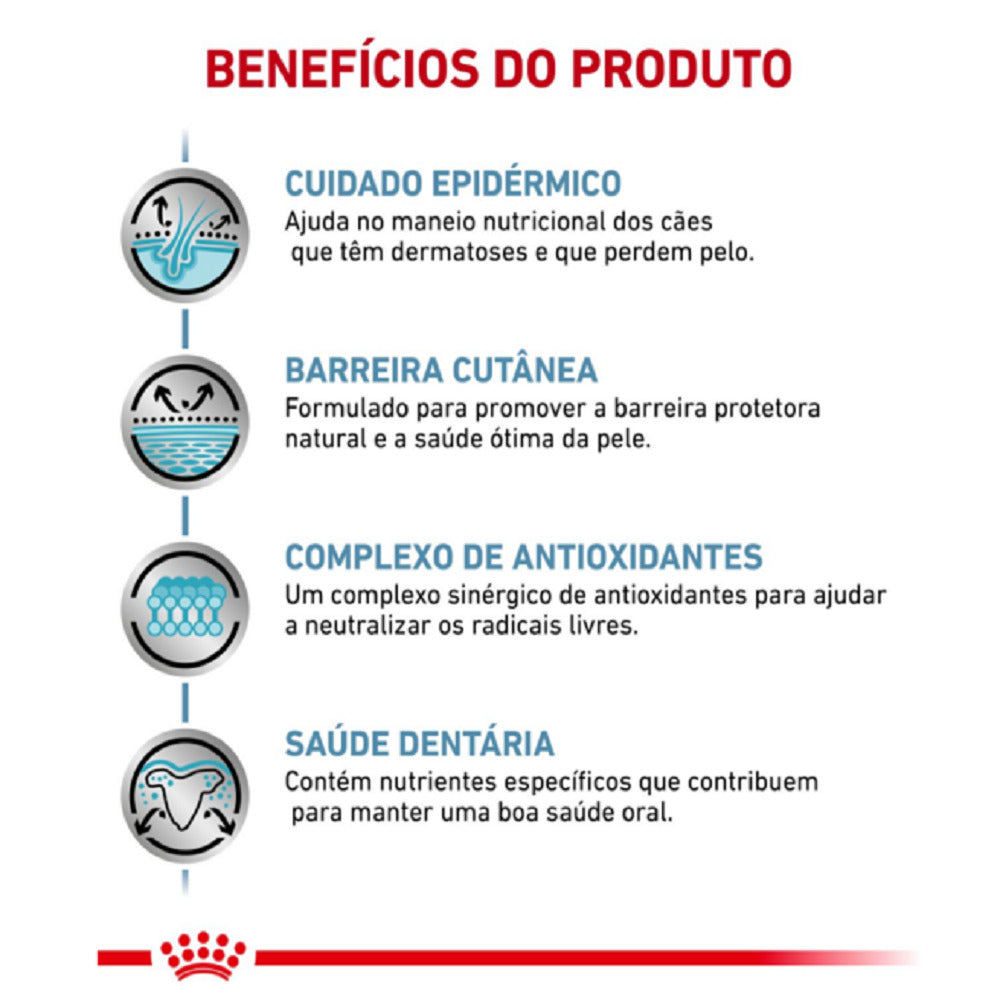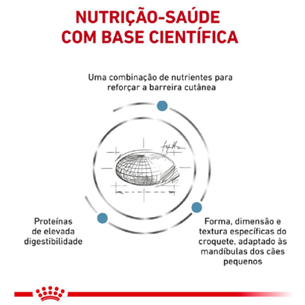 Royal Canin Veterinary Diet Skin Care Adult Small é uma ração seca coadjuvante indicada para cães adultos de pequeno porte (até 10 kg) com pele sensível ou propensão a problemas dermatológicos.