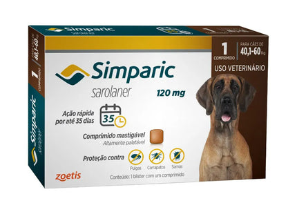 Simparic 120 mg é um comprimido antipulgas, carrapatos e sarnas mastigável, altamente palatável, indicado para cães de 40,1 a 60 kg, a partir de 8 semanas (6 meses no Canadá).