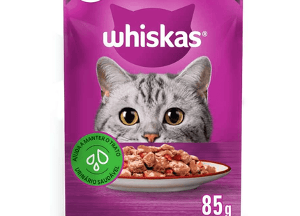 WHISKAS® Sachê Jelly – Refeição úmida completa para gatos adultos em sachê de 85 g, disponível nos sabores Peixe e Carne. Preparado com pedaços macios cozidos a vapor, sem conservantes, corantes ou aromatizantes artificiais.